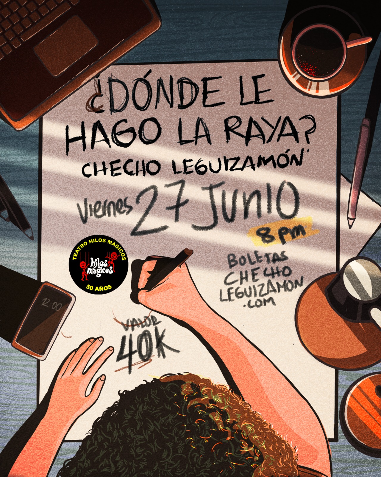 Hace rutinas de comedia? Sí, sí hace. Interactúa con el público? Sí, también. Y me dice que también hay dibujo en vivo? Sí. Y entonces eso es un Stand up comedy? No, fíjese que no. Entonces qué es? Es » Dónde le hago la raya? presentando por Checho Leguizamon.